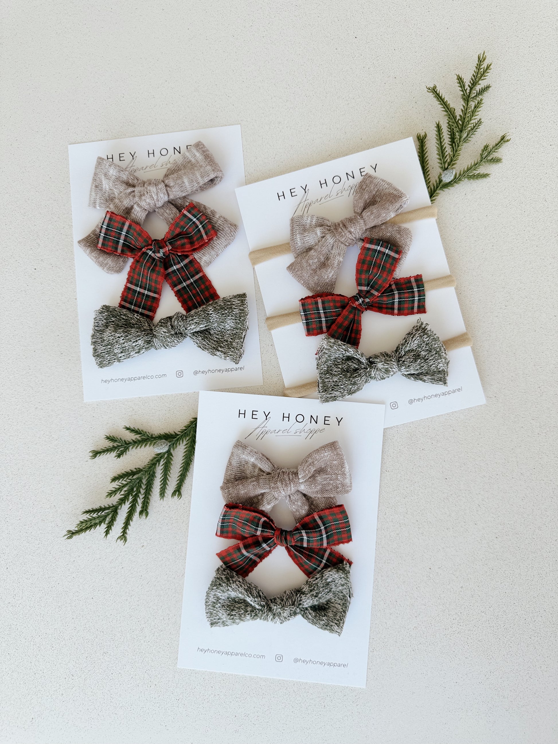 Heather tan classic | Red and Green ribbon | Heather green knot bow