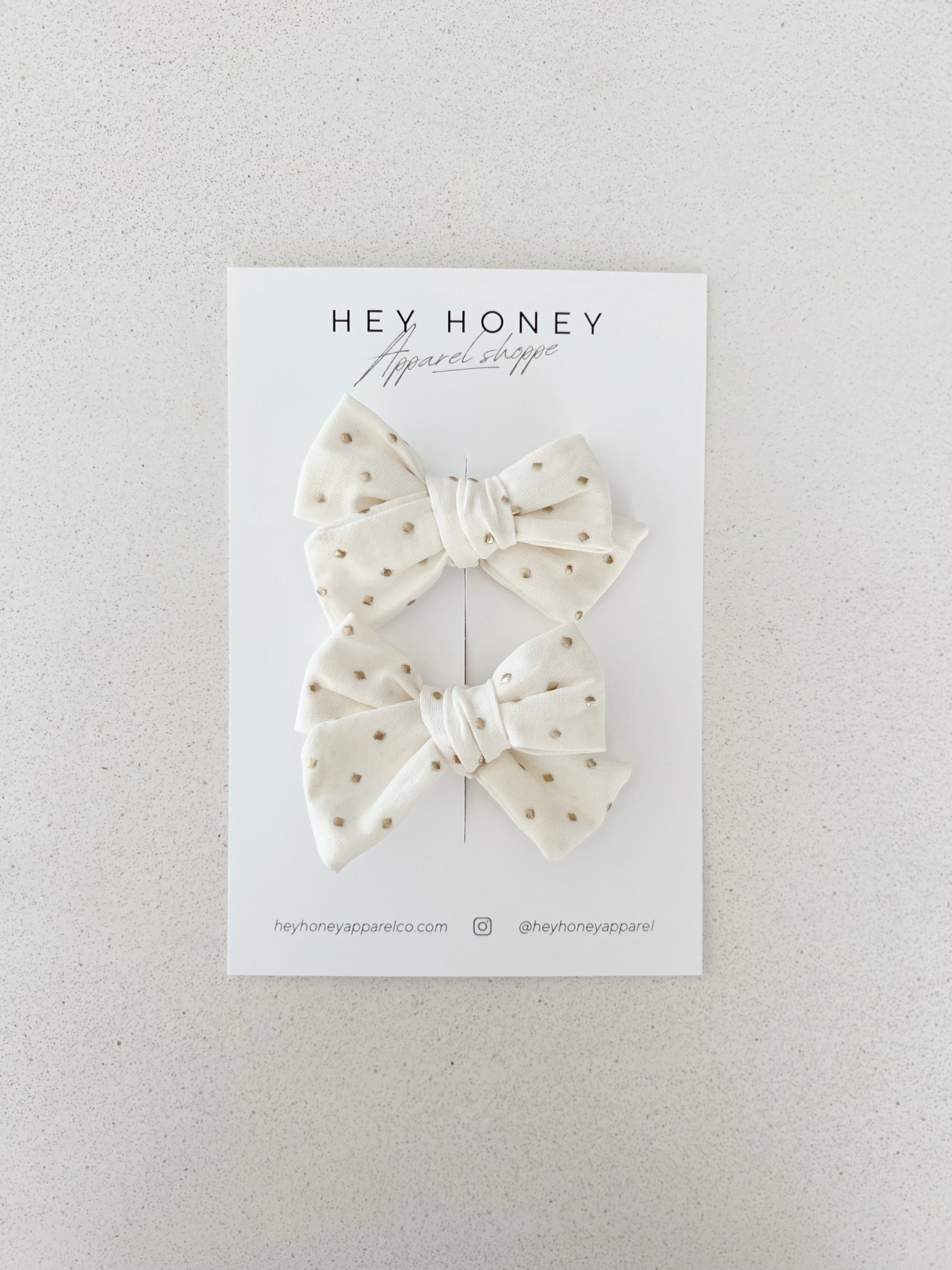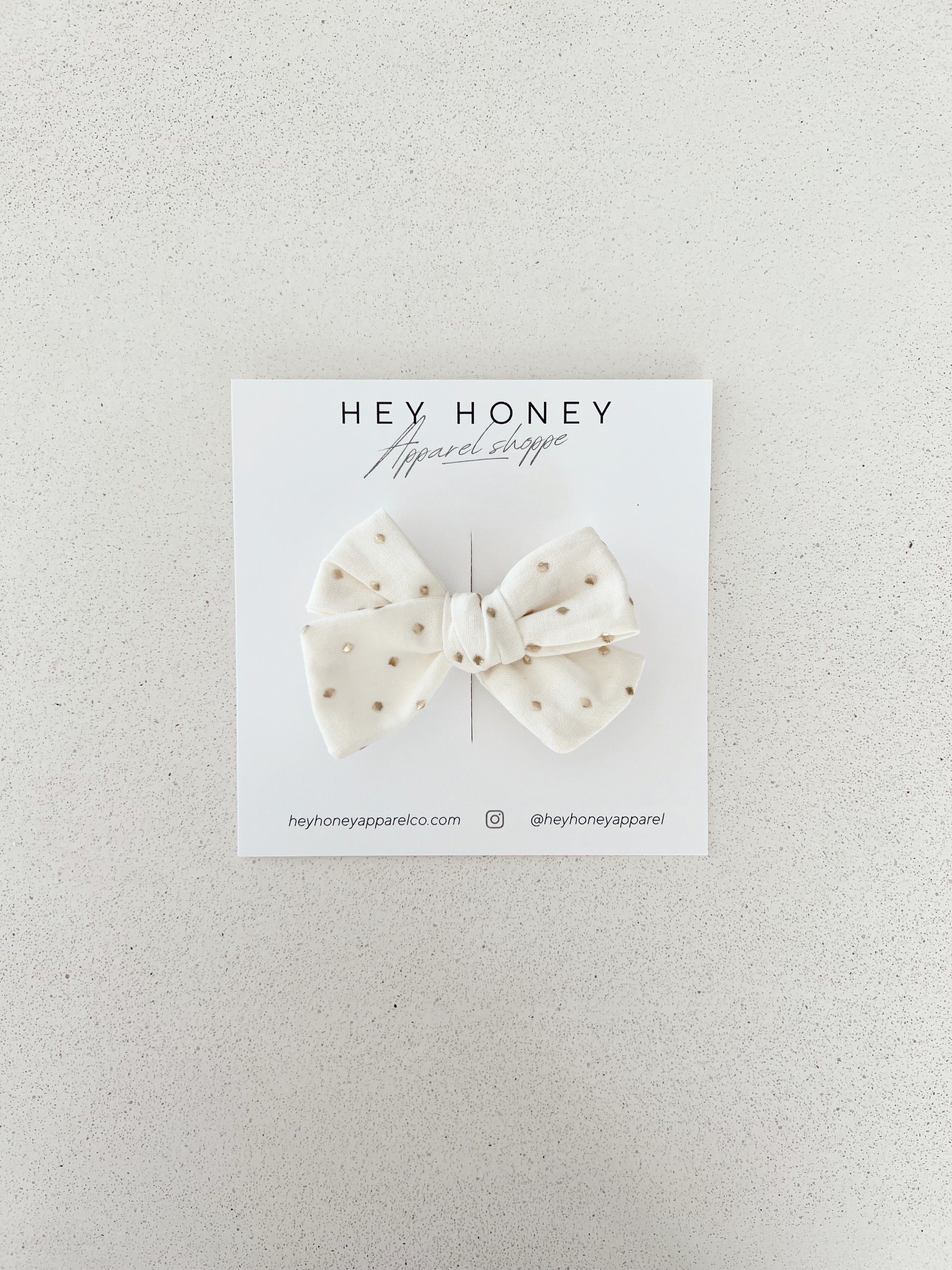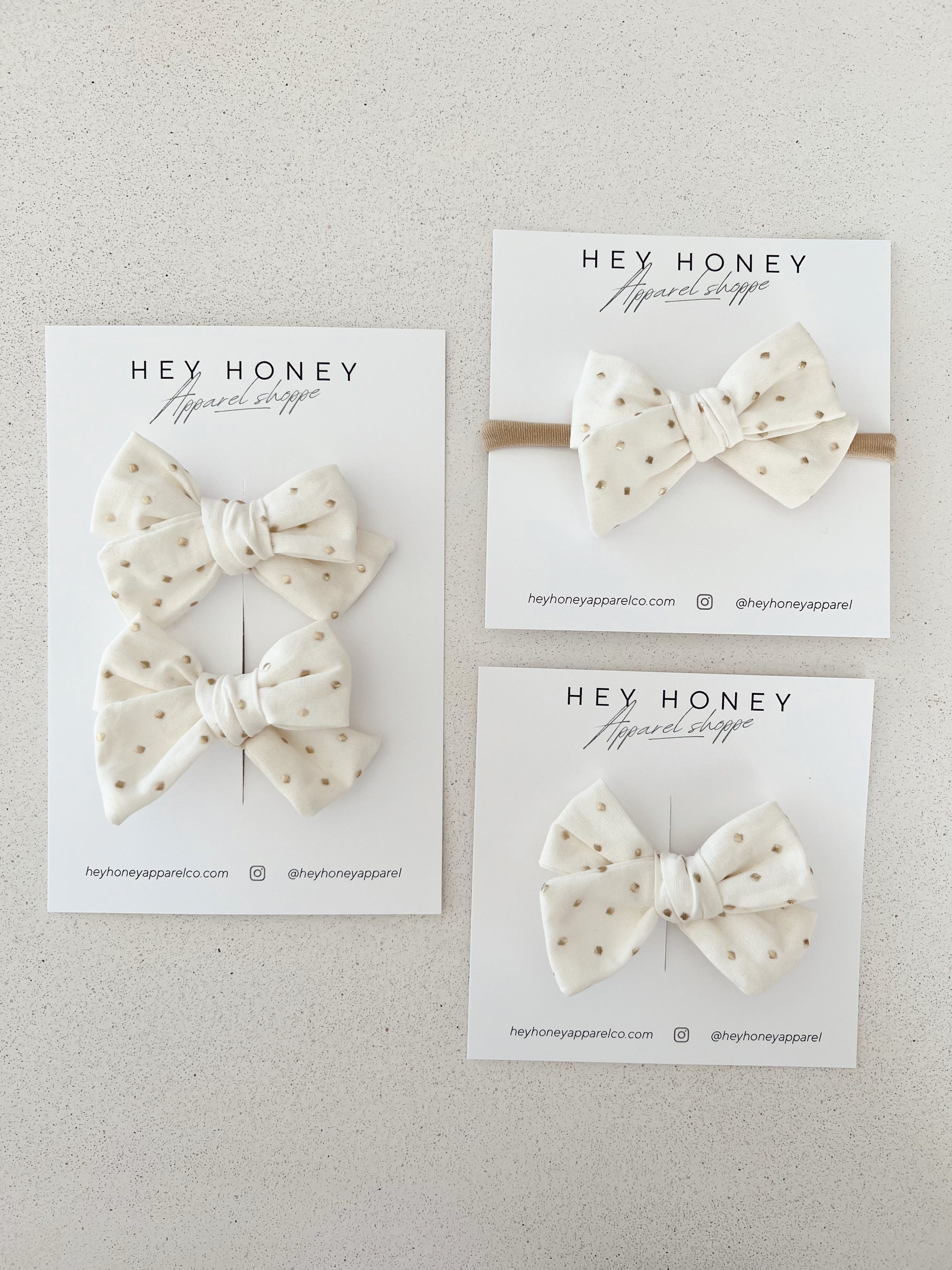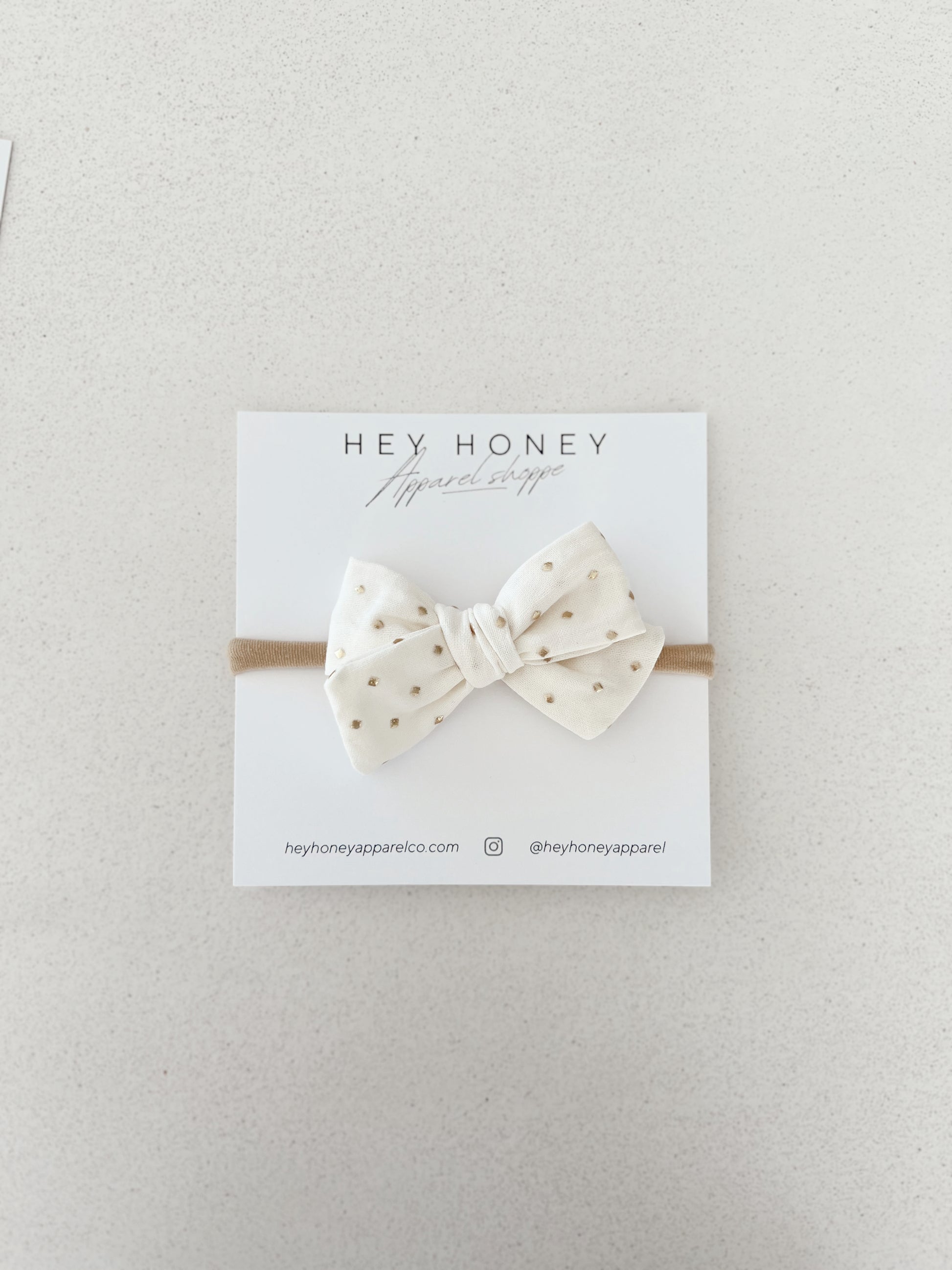 A creamy white bow with gold diamond speckles. Dress it up or down, this nuetral is good for any occasion! It comes in 3 styles: