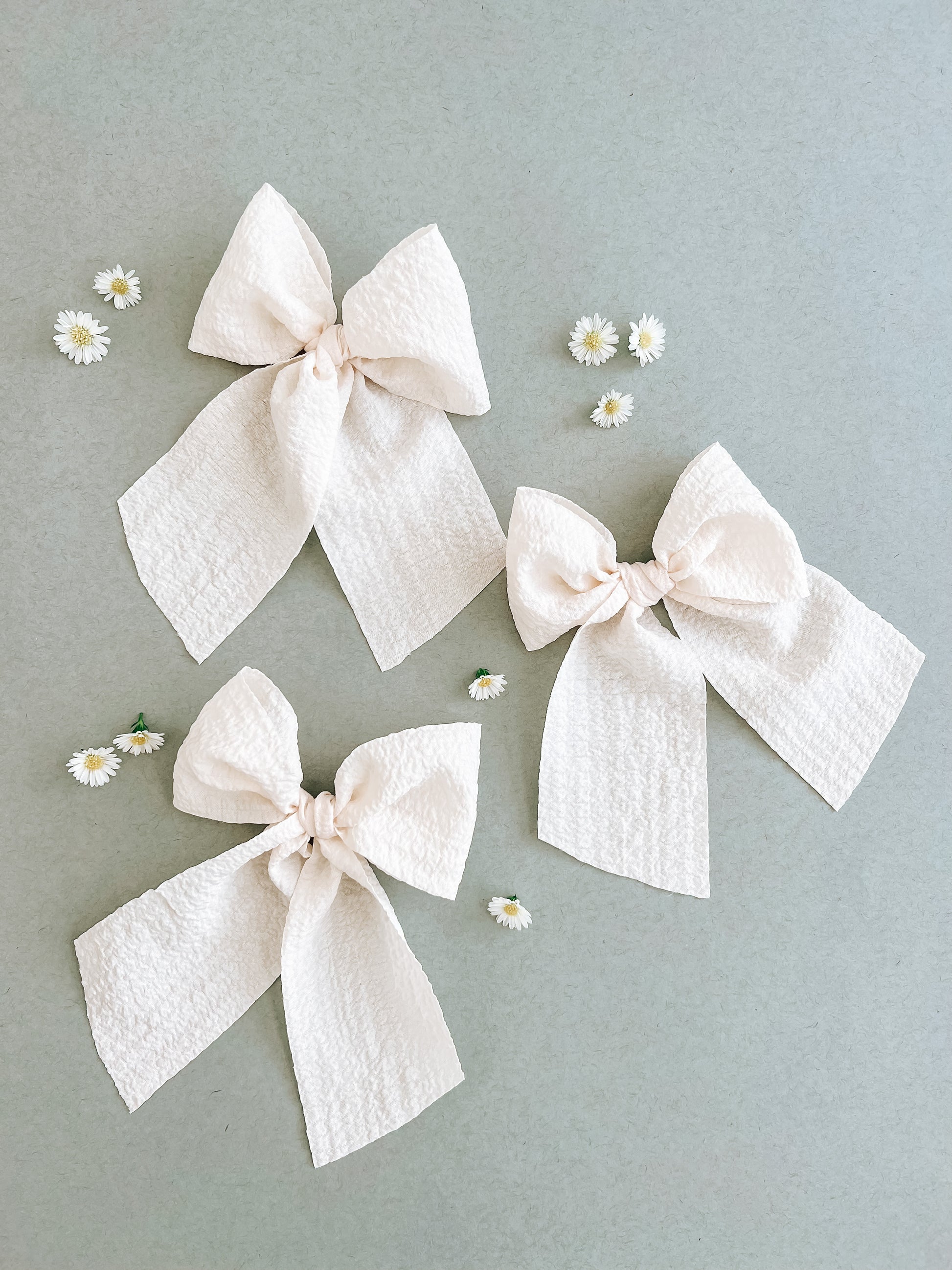 The Lucy Bow has an elegant texture and comes in a beautiful cream color. The material makes it easy to dress up any outfit. It comes in one size on a clip.
